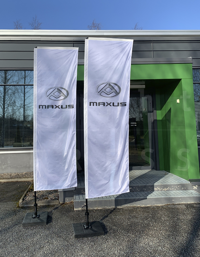 Ulkokäyttöön soveltuva Beach ja Storm Flag on painettu laadukkaalle kankaalle. Kuva painetaan läpipainettuna ja se näkyy toisella puolella peilikuvana. Lipun muodon ja korkeuden sekä jalustan voi valita käyttötarkoituksen ja kuvan mukaan.